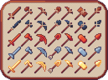 This set includes 7 core tools and weapons, each rendered in 5 different material tiers:
